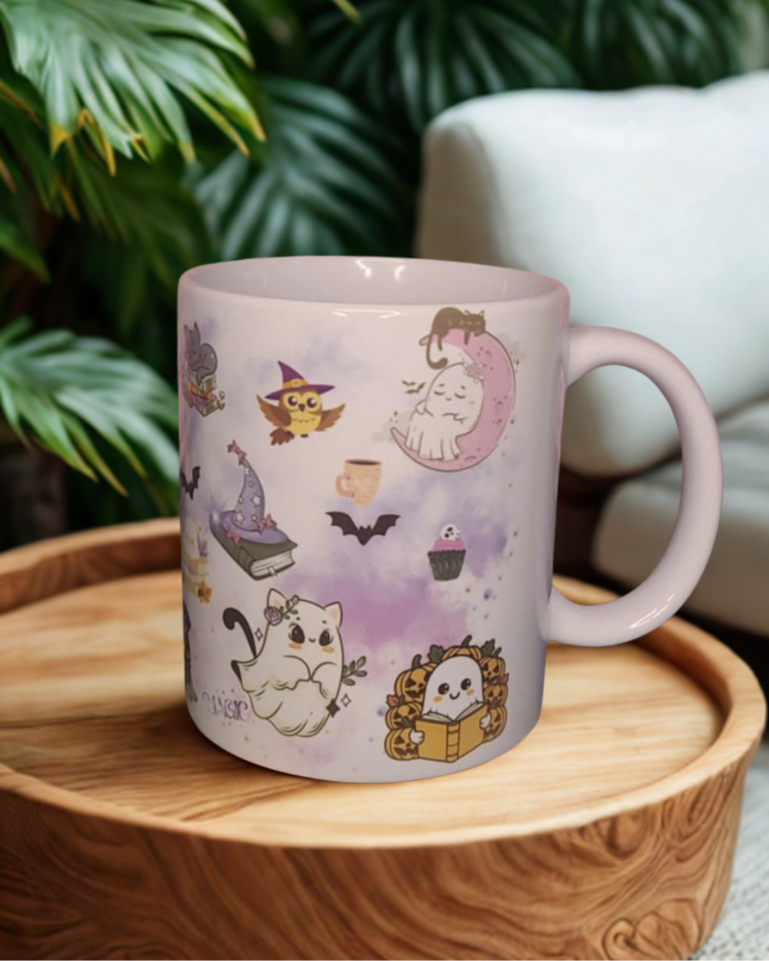 Ornée de petits personnages adorables – chats sorciers, fantômes espiègles, hiboux rêveurs et potions magiques – elle évoque la douceur et la fantaisie de la saison d’automne et d’Halloween.