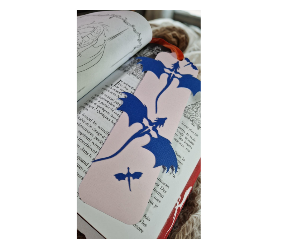 Fabriqué avec soin, il arbore une silhouette de dragon majestueuse et puissante, découpée dans un bleu intense et vibrant qui captera l'œil. C'est l'incarnation parfaite de la magie et de l'aventure qui se cachent entre les pages de vos livres. Sa conception verticale met en scène deux dragons en plein vol, créant un effet de relief élégant et aérien.